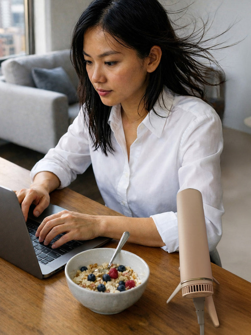 Reclaim your freedom with the Hands Free Dryer. Snap it onto the magnetic tripod, relax your arms, and scroll, work, or get ready while you dry.
